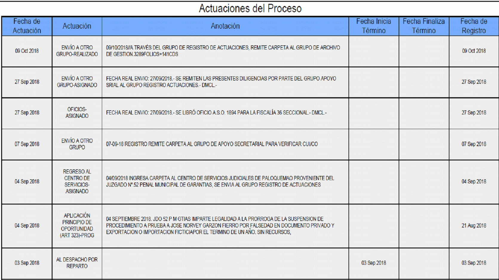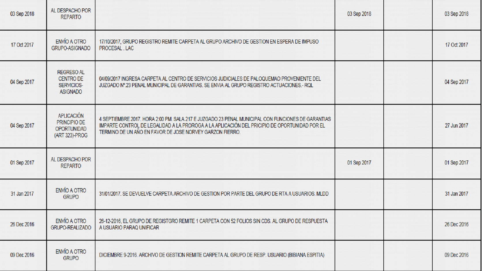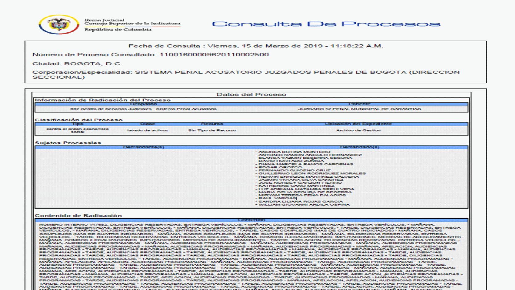 Consultada la página de la Rama Judicial, el proceso 11001600009620110002500, llevado a cabo en contra de, entre otros, el señor Raúl Vargas y que dio origen a la imposición de medida de aseguramiento, la suspensión en el ejercicio del cargo y finalmente el reintegro a la DIAN, en razón a la expedición de la boleta de libertad por vencimiento de términos, se encuentra en el siguiente estado a la fecha de expedición de la presente providencia:
