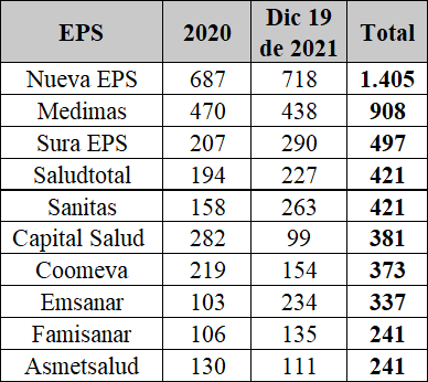 Tabla 5. Elaboración propia. Datos MSPS y Sispro.