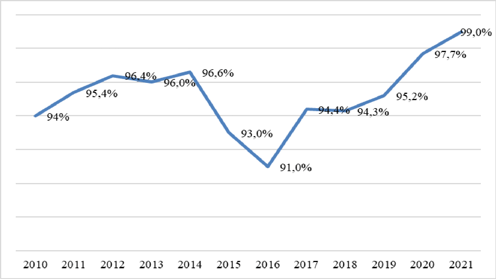 De acuerdo con Estudio Nacional de Evaluación de los Servicios de las EPS 202, la proporción de usuarios que consideró fácil o muy fácil acceder a un servicio de salud, fue para los años 2014, 54%; 2016, 48.9%; 2017, 43.4%; 2018, 42.1%; 2019, 65.9%; 2020, 62% y 2021, 78%. Lo anterior, demuestra que en 2014 y como bien lo reconoció el MSPS, el 46% de los usuarios consideraron difícil acceder a estos en su EPS, situación que fue para el 2016 de 51,1%; 2017, 56.6%; 2018, 57.9%; 2019 de 34.1%; 2020 de 38% y 2021 de 22%. Dicho de otro modo, en 3 de los años citados, más del 50% de los encuestados encontraron difícil acceder al SGSSS, no obstante, ese porcentaje ha ido fluctuando hasta el punto de reportar en el 2021, el más bajo de todos los años que se analizan, lo que sirve de indicativo para inferir que la prestación del servicio ha mejorado y se han implementado en mayor medida de las atenciones virtuales y la telemedicina.