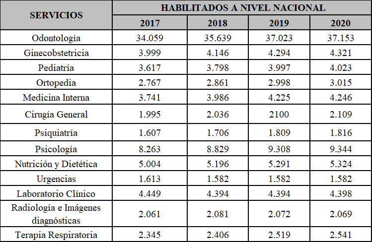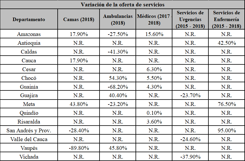 También dio a conocer la Resolución 1268 de 201 y señaló que al mes de diciembre de 2016 la PPNA era de 554.364, lo que evidenció una disminución de aquellas personas que no contaban con afiliación en salud. Además, afirmó que la prestación de servicios de salud en el territorio nacional estaba constituida por actores e instituciones prestadoras que debían cumplir con lo establecido en el Sistema Único de Habilitación –SUH, por lo que a partir de los prestadores inscritos en el REPS, se podía identificar la oferta disponible para la atención en salud en sus fases de protección específica, detección temprana, diagnóstico, tratamiento y rehabilitación de la enfermedad y presentó la información consolidada de la oferta de servicios habilitada, dentro de las que se evidenciaron falencias y disminución de coberturas en algunos departamento.