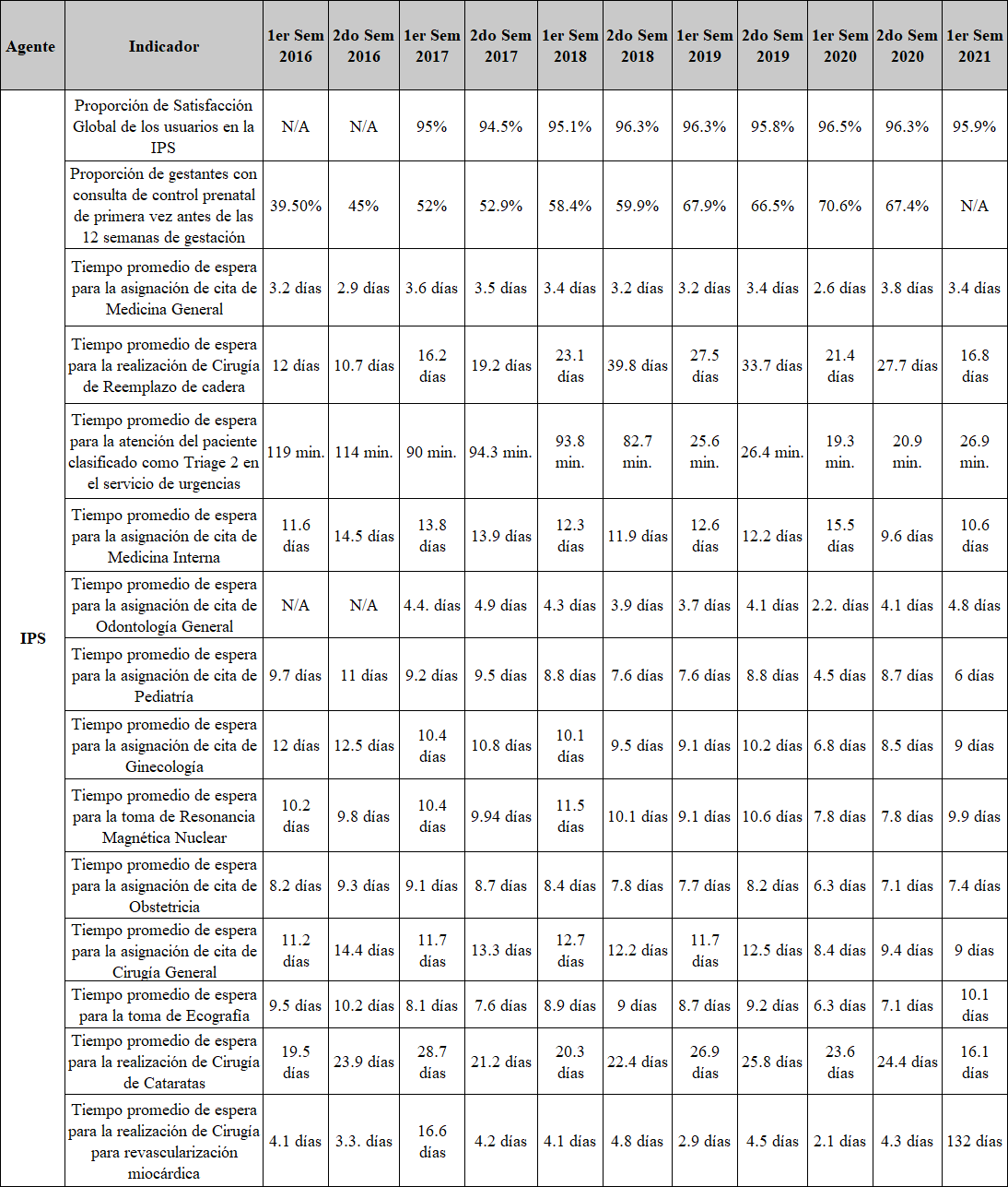 En relación con la calidad de la atención en salud, puede decirse que el Gobierno nacional adoptó medidas conducentes para garantizarla a través de la vigilancia y control a la prestación de servicios, entre ellas los indicadores de experiencia en la atención para IPS, EABP y DTS publicados en Sispro y la creación del SOGCS. Los primeros permiten medir la calidad, a través de la verificación de la oportunidad en la prestación de servicios. Al respecto, se reportaron mejoras relevantes en temas de vacunación de menores de edad, asistencia de mujeres al primer control antes de la semana doce de gestación, tiempos en la asignación de citas con medicina general, pediatría, programación de cirugías de reemplazo de cadera y de cataratas, lo que facilita el acceso de los usuarios al sistema de salud, pues dio a conocer que para la última de las mencionadas, se pasó de 24 días en 2020 a 16 en 2021 para su programación, lo que demuestra un avance importante.