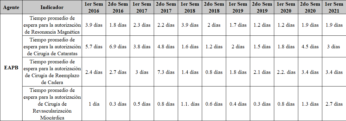 De la tabla, se deduce que el término para llevar a cabo la autorización del procedimiento de cirugía de cataratas y las resonancias magnéticas, disminuyó notablemente para el año 2021, lo que representa una mejoría en cuanto a prestación del servicio de salud en términos de oportunidad y calidad para los usuarios de este. Sin embargo, la autorización de la cirugía de revascularización miocárdica reportó en el 2016, 1 día, tiempo que disminuyó en 2017, 2018, 2019 y 2020. Ahora bien, para el primer semestre del 2021 se dio a conocer un tiempo que supera los anteriores y que indica que son 2.7 días lo que toma la entidad en autorizar el procedimiento, a lo que se debe sumar los que se toma la EPS para dar materialidad a tales autorizaciones. Es decir, aparentemente las medidas implementadas durante el 2021 en torno al asunto que se analiza no han tenido el impacto esperado y contrario a ello, han dilatado la garantía del derecho fundamental a los pacientes con padecimientos coronarios, lo que implica una labor adicional que permita disminuir los tiempos.
