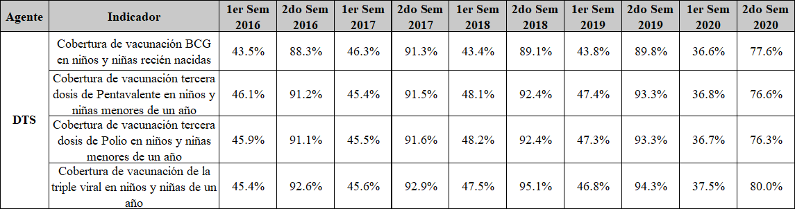 De acuerdo con la tabla anterior, desde el año 2016 se han obtenido avances respecto de inmunización, así como indicadores que sobrepasan el promedio mundiahttps://www.who.int/es/news-room/fact-sheets/detail/immunization-coverage, situación que debe resaltarse dada la importancia que ello genera en temas de prevención de enfermedades, discapacidades y defunciones por padecimientos que se pueden preveni, como lo son la difteria, tos convulsa, tétanos, influenza tipo b y hepatitis B -pentavalente-, tuberculosis -BCG-, polio, sarampión, rubeola y parotiditis.