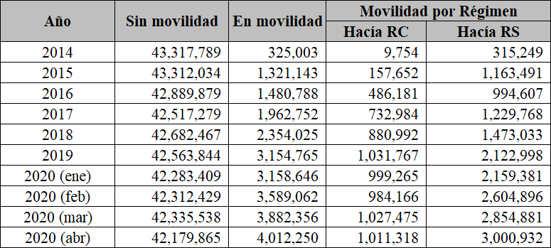 Número de afiliados que hicieron uso de la movilidad entre regímenes, la forma en que esta se llevó a cabo -ascendente y descendente-.