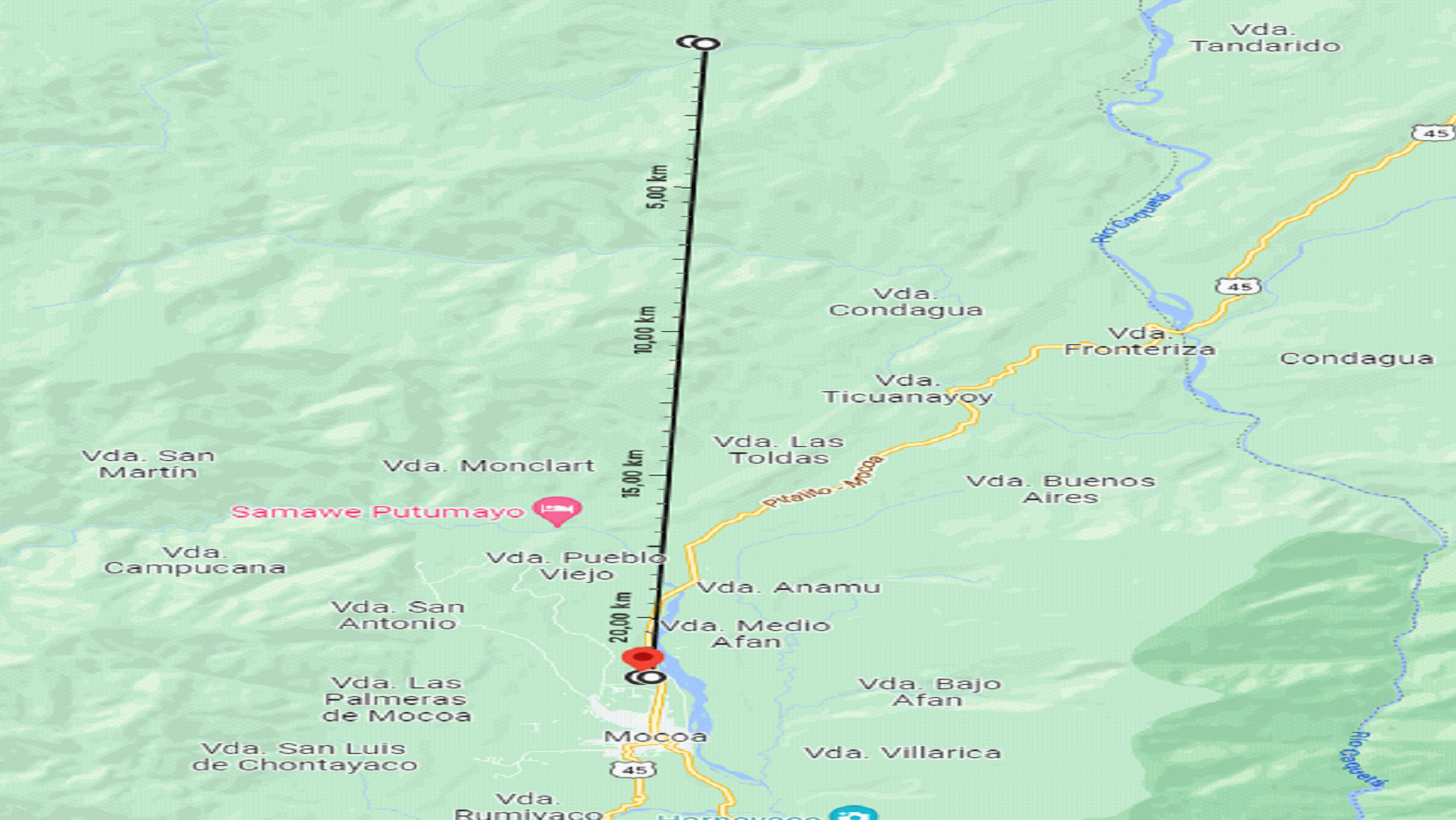 26. Sin embargo, los hechos objeto de investigación tampoco demuestran el concepto expansivo de territorio porque no pueden ser remitidos culturalmente al ámbito territorial de la comunidad indígena a la que pertenece el procesado. En concreto, el lugar donde aquel fue capturado no guarda relación con el desarrollo de la cultura de la comunidad, pues allí no están involucradas sus costumbres, ritos, creencias religiosas, modos de producción, entre otro. En efecto, el procesado fue capturado en el kilómetro 5 de la vía Mocoa – Pitalito, mientras que el sitio al que debía acudir al retiro espiritual está ubicado en la vereda Yunguillo en el Municipio de Mocoa (Putumayo). La distancia entre el lugar en el que fue realizada la captura y el Resguardo ubicado en la vereda Yunguillo supone un recorrido de 20 kilómetros en línea recta, como puede evidenciarse en la siguiente imagen satelital tomada del sitio web de Google:
