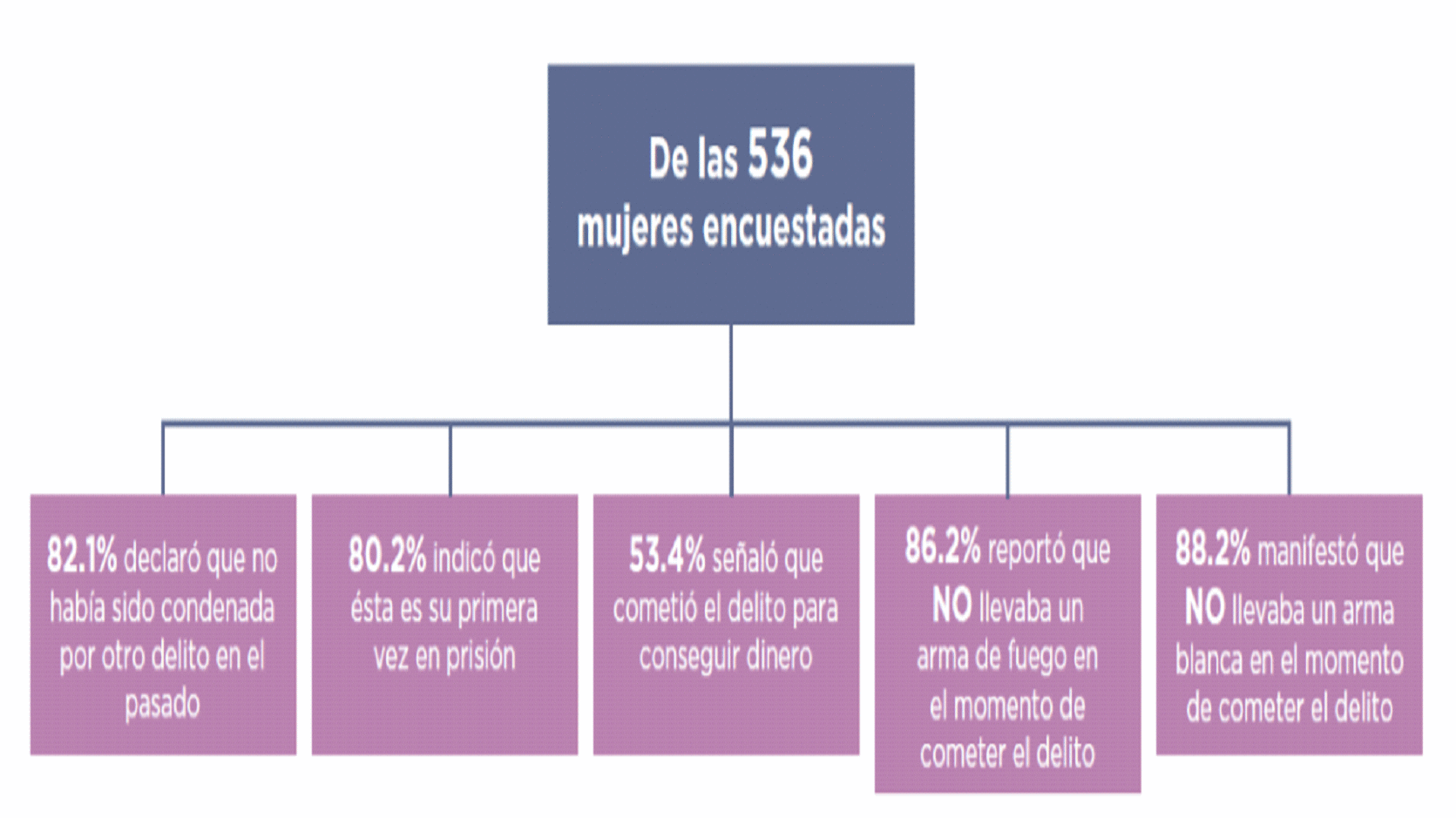 Frente a la situación carcelaria de las mujeres, la exposición de motivos trajo a colación los siguientes datos: Según el INPEC, “a enero de 2019 había un total de 13 mujeres lactantes y 74 madres gestantes privadas de la libertad” De acuerdo con la investigación adelantada por el CIDE, la Pontificia Universidad Javeriana y el CICR: (i) el 66% de las mujeres privadas de la libertad pertenecen a estratos socioeconómicos bajos (estratos 1 y 2); (ii) antes de la privación de la libertad el 72,8% tenían ingresos inferiores a dos salarios mínimos mensuales vigentes; (iii) el 74,9% son madres cabeza de familia; y, (iv) el 56.6% tiene un bajo nivel de escolaridad Adicionalmente, en la investigación se consigna que “la mayoría de estas mujeres reportaron haber cometido el delito por razones relacionadas a su vulnerabilidad económica (…). El 82,5% de las mujeres privadas de la libertad entrevistadas no tienen antecedentes penales y generalmente son condenadas por delitos que no implican el uso de la violencia.