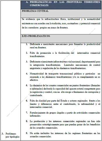 Adicional a los referidos hitos normativos, y sin perjuicio de los distintos proyectos de ley modificatorios a la Ley 191 de 1995 que no tuvieron curso exitoso en el Congreso de la República, y de diversos documentos de política sectorial con impacto en las fronteras, se destaca el documento Conpes 3155 de 2002 “Lineamientos para el Desarrollo de la Política de Integración y Desarrollo Fronterizo”, a partir del cual se avanzó en la creación de los comités territoriales fronterizos mediante actos administrativos departamentales, los cuales sin embargo no lograron ir más allá de la etapa de creación. Finalmente, algunos otros documentos Conpes han tenido especial relevancia en algunos territorios de fronteras, como por ejemplo el Conpes 3739 de 2013 por el cual se plantea una estrategia para el desarrollo integral de la región del Catatumbo, este busca: i) Incrementar el crecimiento y la generación de empleo, ii) Mejorar la igualdad de oportunidades y aportar a la reducción la pobreza, iii) Contribuir a la consolidación de la paz y al incremento de la seguridad. iv) Contribuir a la sostenibilidad ambiental de la Región. v) Mejorar las capacidades institucionales de la Región. Finalmente el Conpes 3603 de 2009 sobre Política
