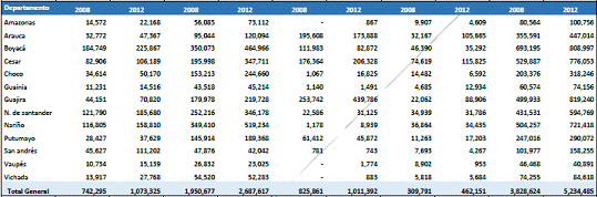 33. Información tomada del documento Colombia: Monitoreo de cultivos de coca 2012 de UNODC y el Gobierno de Colombia (p. 17-18). La publicación presentada el 08-08-2013 tiene la siguiente nota: Derechos reservados, Esta problemática aumenta los niveles de corrupción, debilita la insuficiente institucionalidad local y los procesos democráticos locales y regionales, y potencia el control de grupos al margen de la ley.