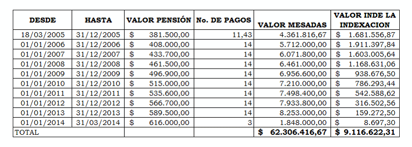 La demandada deberá cancelar a favor del actor un retroactivo pensional por valor de $62.306.416.67, causado entre el 18 de marzo de 2005 y el 31 del mismo mes del año 2014, conforme se explica a continuación:
