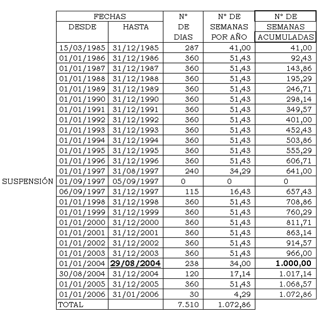 Según lo anterior, para la fecha de entrada en vigencia de la Ley 797 de 2003, norma creadora de la pensión en cuestión, 29 de enero de 2003 (fecha de la publicación), la actora ya tenía una hija en estado de invalidez; la demandante se favoreció del retén social por su condición de “madre cabeza de familia” en el proceso de reestructuración de TELECOM que inició con el D. 1615 de 2003; y, en el año 2004, completó las 1000 semanas de cotización al sistema de pensiones que exigía, para ese entonces, el artículo 33 de la Ley 100 de 1993, como tope mínimo para acceder a la pensión de vejez, como se puede ver en el siguiente cuadro:
