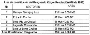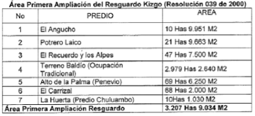 2. Que ante las reiteradas reclamaciones al Gobierno nacional por parte de las autoridades indígenas de Kizgó respecto a la devolución del territorio, el Resguardo Indígena fue constituido mediante Resolución del Incora número 078 del 18 de diciembre de 1992 con área de 356 hectáreas 8.860 m2 y posteriormente ampliado con la Resolución del Incora número 039 del 3 de octubre de 2000 con área de 3.207 hectáreas y 9.034 m2. El área total del resguardo en la actualidad es de 3.564 hectáreas y 7.894 m2.