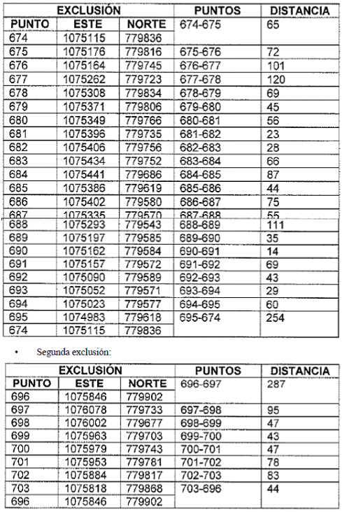 Donde a este globo se le hacen unas exclusiones de predios de propiedad privada con las siguientes coordenadas y distancias respetivas: