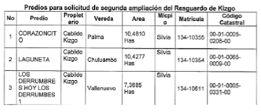 Así mismo se solicitará cancelar los folios de las siguientes matrículas inmobiliarias: número 134-10355, número 134-10354, número 134-10611, número 134-11222, número 134-2053, número 134-3881, número 134-6913, número 134-11324, número 134-6164, número 134- 137, número 134-12314, número 134-11299, número 314-1263, número 134-13613, número 134-4450, número 134-7913, número 134-7649, número 134-5925, número 134-3832, número 134-3833, número 134-5316, número 134-8767, número 134- 459, número 134-12393, número 134-790, número 134- 2136, número 134-9656, número 134-1527, número 134-10907, número 134-1148, número 134-3113, número 134-10909, número 134-10904, número 134-10906, número 134-3110, número 134-1238, número 134-14076, número 134-5064, número 134-9446, número 134-16644, número 134- 10867, número 134- 5099, número 134-16630, número 134-13611, número 134-13612 y número 134-7621, en jurisdicción del municipio de Silvia, departamento del Cauca, que corresponden a los bienes inmuebles con los cuales se amplía por segunda vez el resguardo de Kizgo.