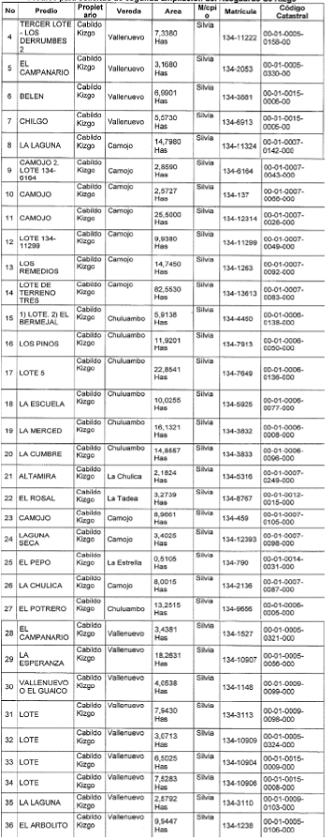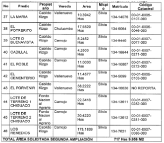 5. Que una vez culminados los Cincuenta y Cinco (55) Estudios Jurídicos de Títulos, se determinó que cuarenta y seis (46) resultaron positivos y nueve (9) negativos, estableciéndose en el Estudio Socioeconómico Jurídico y de Tenencia de Tierras, que la ubicación de los predios de la segunda ampliación corresponde al municipio de Silvia, departamento del Cauca, en las veredas Camojo, La Tadea, Chuluambo, Vallenuevo, La Chulica y La Estrella.