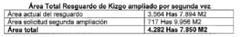El área actual del resguardo es de tres mil quinientas sesenta y cuatro (3.564) hectáreas, siete mil ochocientos noventa y cuatro (7.894) metros cuadrados, que sumadas a las setecientas diecisiete (717) hectáreas, nueve mil novecientos cincuenta y seis (9.956) metros cuadrados, solicitadas para la segunda ampliación, define un área total superficiaria de cuatro mil doscientas ochenta y dos (4.282) hectáreas, con siete mil ochocientos cincuenta (7.850) metros cuadrados, según el plano de la agencia nacional de tierras número ACCTI 1974340 de agosto de 2017 (Folio 119 del expediente).