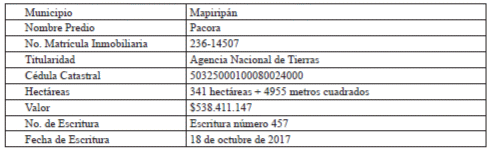 El Predio Pacora está identificado con la matrícula inmobiliaria número 236-14507 de la oficina de Instrumentos Públicos de San Martín, cuya área es de trescientos cuarenta y un (341) hectáreas cuatro mil novecientos cincuenta y cinco (4955) metros cuadrados, adquiridos por la Agencia Nacional de Tierras (ANT) mediante Escritura Pública 457 del 18 de octubre de 2017, de la Notaría Única de San Martín.
