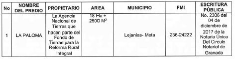 El Predio La Paloma está identificado con el folio de matrícula inmobiliaria número 236-24222 de la Oficina de Instrumentos Públicos de San Martín, cuya área es de dieciocho (18) hectáreas con dos mil quinientos (2.500) metros cuadrados, adquirido por la Agencia Nacional de Tierras mediante Escritura Pública número 2306 del 4 de diciembre de 2017 de la Notaría Única del Círculo Notarial de Granada, como se observa a continuación: