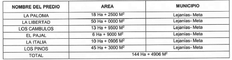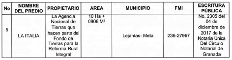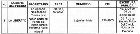 El Predio La Libertad está identificado con el folio de matrícula inmobiliaria número 236-9805 de la Oficina de Instrumentos Públicos de San Martín, cuya área es de cincuenta (50) hectáreas con cero (0000) metros cuadrados, adquirido por la Agencia Nacional de Tierras mediante Escritura Pública número 2304 del 4 de diciembre de 2017 de la Notaría Única del Círculo Notarial de Granada, como se observa a continuación: