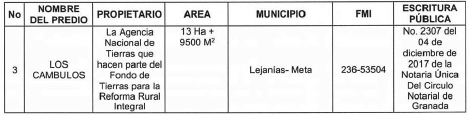 El Predio Los Cámbulos está identificado con el folio de matrícula inmobiliaria número 236- 53504 de la Oficina de Instrumentos Públicos de San Martín, cuya área es de trece (13) hectáreas con nueve mil quinientos (9.500) metros cuadrados, adquirido por la Agencia Nacional de Tierras mediante Escritura Pública número 2307 del 4 de diciembre de 2017 de la Notaría Única del Círculo Notarial de Granada, como se observa a continuación: