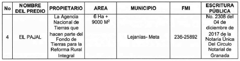 El Predio El Pajal está identificado con el folio de matrícula inmobiliaria número 236- 25892 de la Oficina de Instrumentos Públicos de San Martín, cuya área es de seis (6) hectáreas con nueve mil (9.000) metros cuadrados, adquirido por la Agencia Nacional de Tierras mediante Escritura Pública número 2308 del 4 de diciembre de 2017 de la Notaría Única del Círculo Notarial de Granada, como se observa a continuación: