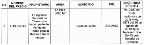 El Predio Los Pinos está identificado con el folio de matrícula inmobiliaria número 236-2693 de la Oficina de Instrumentos Públicos de San Martín, cuya área es de cuarenta y tres (45) hectáreas con tres mil (3.000) metros cuadrados, adquirido por la Agencia Nacional de Tierras mediante Escritura Pública número 2150 del 13 de noviembre de 2018 de la Notaría Única de Granada, aclara mediante escritura pública número 2571 del 20 de agosto de 2019, como se observa a continuación: