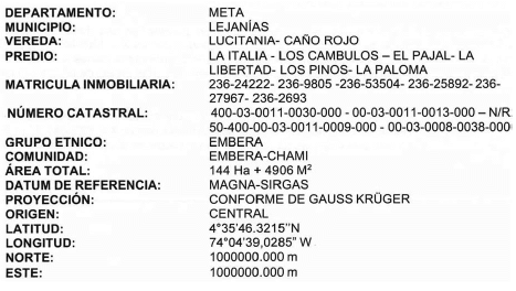 Artículo 1º. Constituir el Resguardo Indígena Doquera, del pueblo Embera Chami, localizado en el municipio de Lejanías, departamento del Meta, en seis (6) predios, propiedad del Fondo de Tierras para la Reforma Rural Integral denominados “La Paloma, La Libertad, Los Cámbulos, El Pajal, La Italia y Los Pinos” e identificados con folios de matrícula inmobiliaria 236-24222, 236-9805, 236-53504, 236-25892, 236-27967, 236- 2693. El área total superficiaria es de ciento cuarenta y cuatro (144) hectáreas con cuatro mil novecientos seis (4.906) metros cuadrados, según el plano de la ANT número ACCTI 50400543 de octubre de 2019, identificado, de conformidad con la siguiente redacción t écnica de linderos: