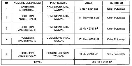 2. Predios con los cuales se constituirá el Resguardo Indígena INKAL WATZAL: Posesiones Ancestrales: