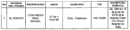 El Predio el Achapo está identificado con el folio de matrícula inmobiliaria número 442-70255 de la Oficina de Instrumentos Públicos de Puerto Asís, cuya área es treinta y siete (37) hectáreas con cuatro mil ciento cuatro (4.104) metros cuadrados, adquirido por la comunidad Inkal Watzal mediante Escritura Pública número 286 del 19 de junio de 2018 de la Notaría Única del Círculo Notarial de Orito, como se observa a continuación: