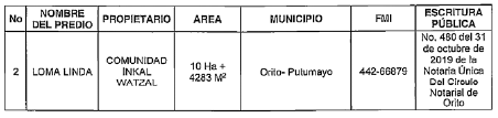El Predio Loma Linda está identificado con el folio de matrícula inmobiliaria número 442-66879 de la Oficina de Instrumentos Públicos de Puerto Asís, cuya área es de diez (10) hectáreas con cuatro mil doscientos ochenta y tres (4.283) metros cuadrados, donado a la comunidad Inkal Watzal mediante Escritura Pública número 480 del 31 de octubre de 2019 de la Notaría Única del Círculo Notarial de Orito, como se observa a continuación: