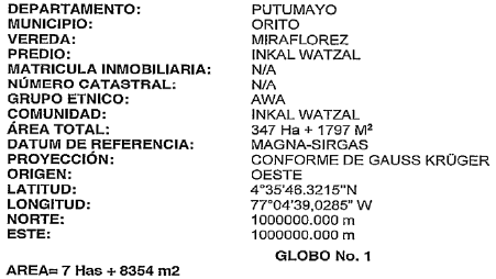 ARTÍCULO 1o. Constituir el Resguardo Indígena INKAL WATZAL, del pueblo Awa, localizado en la vereda Miraflorez, jurisdicción del municipio de Orito, departamento de Putumayo, que se componen por cinco (5) predios baldíos de posesión ancestral y dos (2) predios propiedad de la comunidad identificados con el folio de matrícula inmobiliaria número 442-70255 y número 442-66879 de la Oficina de Instrumentos Públicos de Puerto Asís. El área total es de Trescientos Cuarenta y Siete (347) hectáreas con mil setecientos noventa y siete (1.797) metros cuadrados, según el plano de la Agencia Nacional de Tierras (ANT) número ACCTI 86320513 de septiembre de 2018 y que conforman los siguientes globos de terreno: