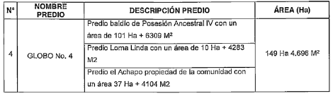 4. GLOBO 4. Dar apertura a un folio de matrícula inmobiliaria correspondiente al globo de terreno que se denominará “predio de posesión ancestral IV”, con un área de ciento un hectáreas con seis mil trescientos nueve metros cuadrados (101 ha + 6309 m2), cuyos linderos y medidas se encuentran descritos en el artículo Primero del presente Acuerdo.