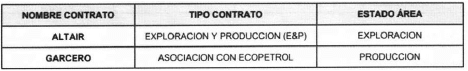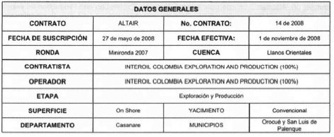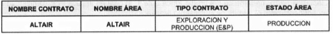 De acuerdo con la Vicepresidencia de Contratos de Hidrocarburos, el Contrato E&P Altair, se encuentra vigente en la etapa de Exploración y Producción y en ejecución de la Fase 1 y 2 Unificadas del Programa Exploratorio Posterior, con fecha de fin de Fase el 27 de abril de 2021. La información general del Contrato en mención se resume en el siguiente cuadro: