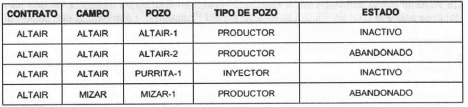 Que así mismo, se encuentra cruce con buffer pozo de hidrocarburos: (i) Altamair-1, de operador Interoil Colombia Exploration and Production de estado descubridor de nuevo campo, (ii) Altamair-2 de operador Interoil Colombia Exploration and Production en estado de abandono, (iii) Mizar-1 de contrato Palermo, operador Interoil Colombia Exploration and production de estado productor (iv) Prurrita-1 de contrato Palermo, operador Interoil Colombia Exploration and production, de estado inyector y (iv) Candalay-1 de contrato Garcero, operador Perenco Colombia Limited, en estado productor. De igual manera, se encuentra un pantano de buffer de título minero estero el Médano de escala 1:100.000.