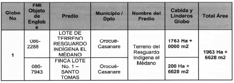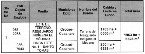 Artículo 1°: Ampliar el Resguardo Indígena El Médano, ubicado en el municipio de Orocué, departamento de Casanare, sobre un predio fiscal patrimonial, que hace parte del Fondo de Tierras para la Reforma Rural Integral, con un área de doscientas hectáreas y seis mil seiscientos veintiocho metros cuadrados (200 ha + 6628 m2), que sumadas a las mil setecientos sesenta y tres hectáreas (1763 ha + 0000 m2) del Resguardo constituido, conforman un área total superficiaria de mil novecientos sesenta y tres hectáreas y seis mil seiscientos veintiocho metros cuadrados (1963 ha + 6628 m2), según plano número ACCTI número 85230713, elaborado por la Agencia Nacional de Tierras.