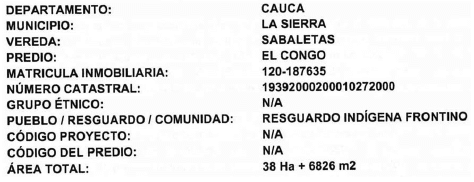 Artículo 1°: Constituir el Resguardo Indígena Frontino, del pueblo Yanacona, ubicado en el municipio de La Sierra, departamento de Cauca, con un (1) predio de propiedad de la Agencia Nacional de Tierras que hace parte del Fondo de Tierras para la Reforma Rural Integral, denominado El Congo, identificado con matrícula inmobiliaria 120-187635, cuya área es de treinta y ocho hectáreas con seis mil ochocientos veintiséis metros cuadrados (38 ha + 6.826 m2), según el plano de la -ANT- N ACCTI 19392621 de mayo de 2017.
