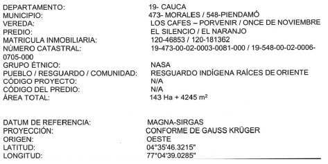 Para lo anterior, es menester tener en cuenta que el Incoder adquirió un predio ubicado en el municipio de Morales Cauca a favor de esta comunidad, ahora bien, el proceso de constitución que está adelantando la ANT desde la UGT Occidente Cauca-Valle del Cauca es con este predio comprado por el gobierno Nacional a favor de la comunidad Indígena de raíces”. Además de esto el predio ubicado en el municipio de Piendamó, es de propiedad privada y fue voluntariamente donado por parte de un comunero al cabildo indígena de raíces de oriente para que haga parte del proceso de constitución.