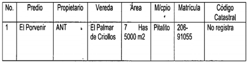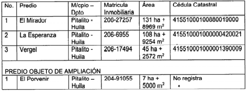 “Parágrafo. El predio con el cual se solicita la ampliación del resguardo se describe a continuación; a) Predio denominado El Porvenir ubicado en la vereda El Palmar de Criollos, municipio de Pitalito, departamento de Huila, el cual, se identifica con la matrícula inmobiliaria número 206-91055 el cual registra un área de 7 ha + 5.000 m2.”