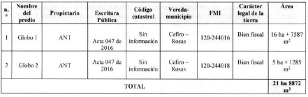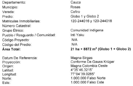 Artículo 1°. Constituir el Resguardo Indígena Inti Yaku, del pueblo Yanacona, sobre dos predios de propiedad de la Agencia Nacional de Tierras, que hacen parte del Fondo de Tierras para la Reforma Rural Integral, denominados Globo 1 y Globo 2, identificados con folios de matrícula 120-244016 y 120-244018 localizados en la vereda Cefiro del municipio de Rosas, departamento del Cauca. El área total del terreno con el cual se constituye el resguardo indígena es de veintiún hectáreas con ocho mil ochocientos setenta y dos metros cuadrados (21 ha + 8872 m2), según el plano topográfico número ACCTI 19622868 realizado por la ANT en agosto de 2020, menos el área de la faja paralela a la línea de cauce permanente de los ríos, arroyos y lagos, hasta de treinta (30) metros de ancho.