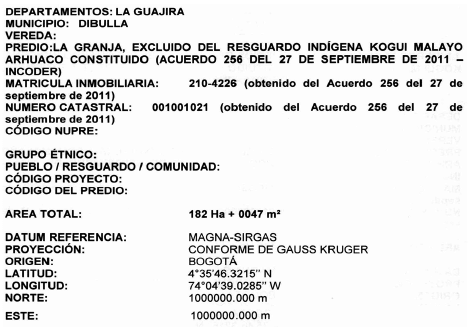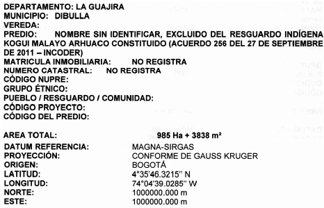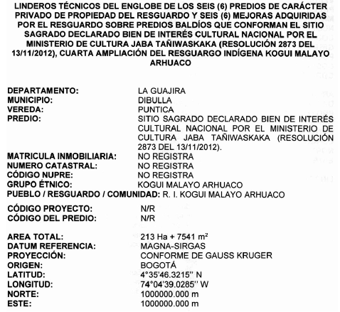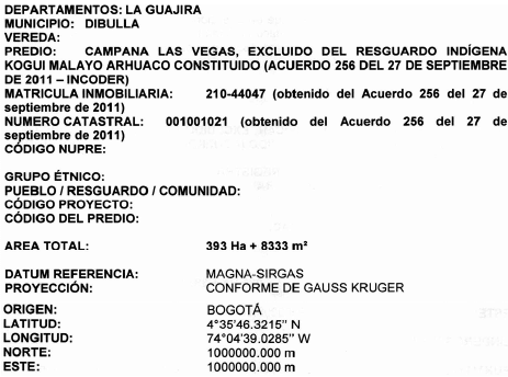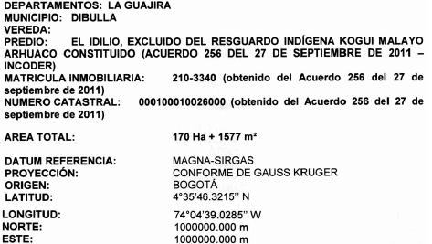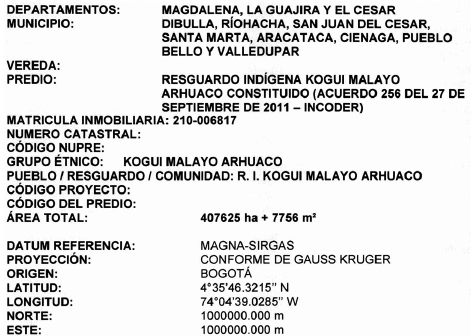 Finalmente, mediante Acuerdo 256 del 27 de septiembre de 2011 por la cual se aclara la Resolución 029 del 19 de julio de 1994, emanada de la Junta Directiva del Incora, que indica como área correcta del resguardo indígena trescientas setenta y nueve mil seiscientas cincuenta y tres hectáreas más siete mil cincuenta y cuatro metros cuadrados (379.653 ha + 7.054 m2) y se amplía con baldíos nacionales, predios adquiridos por la comunidad y predios del Fondo Nacional Agrario, el resguardo indígena Kogui-MalayoArhuaco, en la parte norte; jurisdicción del municipio de Dibulla, departamento de La Guajira.