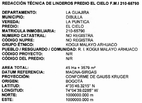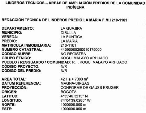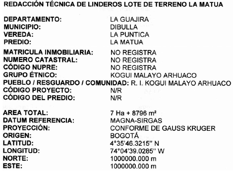 Se tomó como punto de partida el punto número 248, de coordenadas planas N= 1738243.05 m., E= 1082610.71 m., ubicado en el sitio donde concurren las colindancias entre el Predio denominado “La María” del Resguardo Indígena Kogui Malayo Arhuaco y con el globo de terreno denominado “La Matua” del Resguardo Indígena Kogui Malayo Arhuaco, el globo a deslindar colinda así.