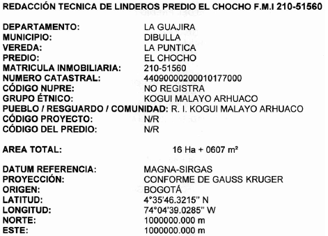 OESTE: Del punto número 166, se continúa en sentido general noroeste, colindando con el Predio denominado “El Chocho” del Resguardo Indígena Kogui Malayo Arhuaco, en línea recta y en una distancia de 246.71 m, hasta encontrar el punto número 160, de coordenadas planas y colindancias conocidas, punto de partida y cierre.