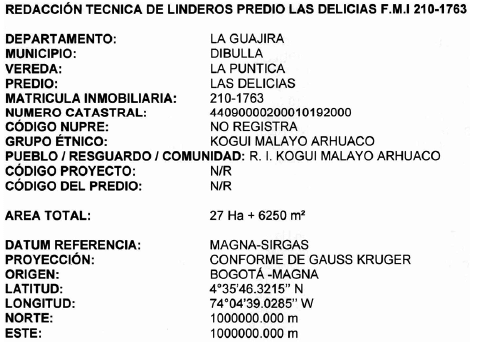 SUROESTE: Del punto número 174, se continúa en sentido general suroeste, colindando con el predio denominado “Las Delicias” del Resguardo Indígena Kogui Malayo Arhuaco, en línea recta y en una distancia de 72.01 m, hasta encontrar el punto número 175, de coordenadas planas N= 1738243.92 m., E= 1082881.66 m., ubicado en el sitio donde concurren las colindancias entre el Predio denominado “Las Delicias” del Resguardo Indígena Kogui Malayo Arhuaco y el globo de terreno denominado “La Esperanza Globo 2” del Resguardo Indígena Kogui Malayo Arhuaco.