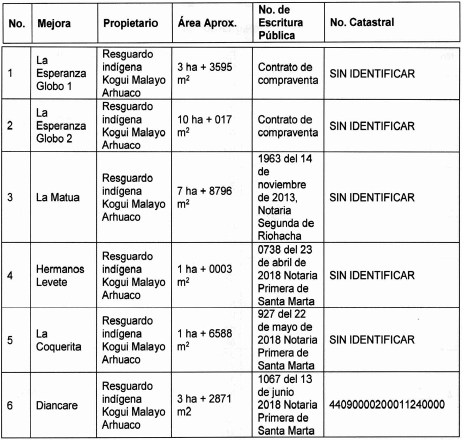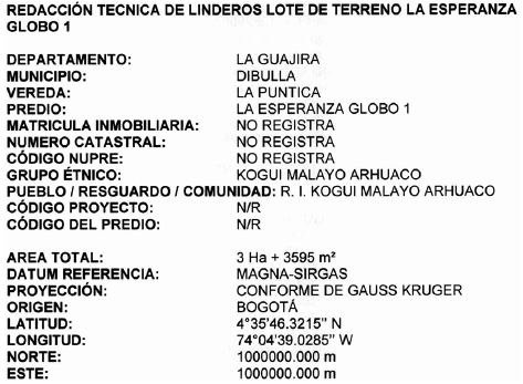 3.2. Dar apertura a dos Folios de matrícula inmobiliaria correspondientes a los predios La Esperanza Globo 1 con un área de 3 ha + 3595 m2 y la Esperanza Globo 2 cuya área es de 10 ha + 0017 m2, cuyos linderos y medidas se encuentran descritos en el artículo segundo del presente acuerdo. Los nuevos folios de matrícula inmobiliaria deberán contener la inscripción del presente acuerdo, con el código registral 01002 y deberá figurar como propiedad colectiva del resguardo indígena Kogui-MalayoArhuaco.