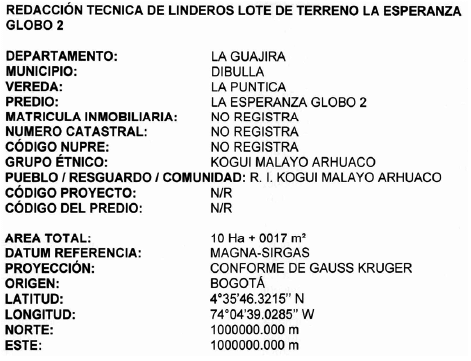 Del punto número 175, se continúa en sentido general noroeste, colindando con el globo de terreno denominado “La Esperanza Globo 2” del Resguardo Indígena Kogui Malayo Arhuaco, en línea recta y en una distancia de 33.10 m, hasta encontrar el punto número 176, de coordenadas planas N= 1738264.12 m., E= 1082855.43 m., ubicado en el sitio donde concurren las colindancias entre el globo de terreno denominado “La Esperanza Globo 2” del Resguardo Indígena Kogui Malayo Arhuaco y el globo de terreno denominado “La Coquerita” del Resguardo Indígena Kogui Malayo Arhuaco.
