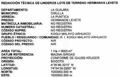 3.4. Dar apertura a la matrícula inmobiliaria correspondiente al predio baldío denominado “Hermanos Levete” (Lote de Terreno), con un área de 1 ha+ 0003 m2, cuyos linderos y medidas se encuentran descritos en el artículo segundo del presente acuerdo. El nuevo registro de la matrícula inmobiliaria deberá contener la inscripción del presente acuerdo, con el código registral 01002 y deberá figurar como propiedad colectiva del resguardo indígena Kogui-Malayo-Arhuaco.