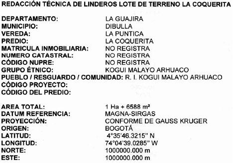 3.5. Dar apertura a la matrícula inmobiliaria correspondiente al predio baldío denominado “La Coquerita” (Lote de Terreno), con un área de 1 ha + 6588 m2, cuyos linderos y medidas se encuentran descritos en el artículo segundo del presente acuerdo. El nuevo registro de la matrícula inmobiliaria deberá contener la ins cripción del presente acuerdo, con el código registral 01002 y deberá figurar como propiedad colectiva del resguardo indígena Kogui-Malayo-Arhuaco.