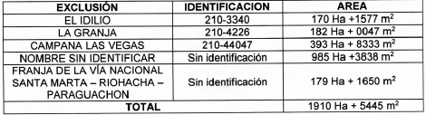 PARÁGRAFO 2°. Quedan excluidos los cuatro títulos de propiedad privada que sumados ascienden a un área de mil setecientas treinta y unas hectáreas más treinta mil setecientos noventa y cinco metros cuadrados (1731 ha + 3795 m2) identificadas en los planos ACCTI 440901116 y ACCTI 440901117 (Folios 182-183) así como el área de la franja de vía la vía nacional Santa Marta - Riohacha - Paraguachón identificada en Resolución número 29 del 19 de Julio de 1994. A continuación, se relacionan dichas áreas: