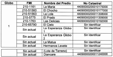 3.7. Proceder al englobe de los siguientes predios (i) Predio La María identificado con matrícula inmobiliaria número 210-1161; (ii) Predio El Chocho identificado con matrícula inmobiliaria número 210-51560; (iii) Predio La Lola identificado con matrícula inmobiliaria número 210-51563 del; (iv) Predio El Prado identificado con matrícula inmobiliaria número 210- 5775; (v) Predio Las Delicias identificado con matrícula inmobiliaria número 210-1763; (vii) Predio el Cielo identificado con matrícula inmobiliaria número 210-65790 y de los Folios aperturados de los predios denominados La Esperanza Globo 1, la Esperanza Globo 2, La Matua, Hermanos Levete (Lote de Terreno), La Coquerita (Lote de Terreno) y Diancare.