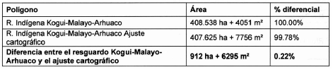 Según lo anterior, resulta un área actual del resguardo Kogui-Malayo-Arhuaco de aproximadamente cuatrocientas ocho mil quinientas treinta y ocho hectáreas y cuatro mil cincuenta y un metros cuadrados (408.538 ha+ 4.051 m2).