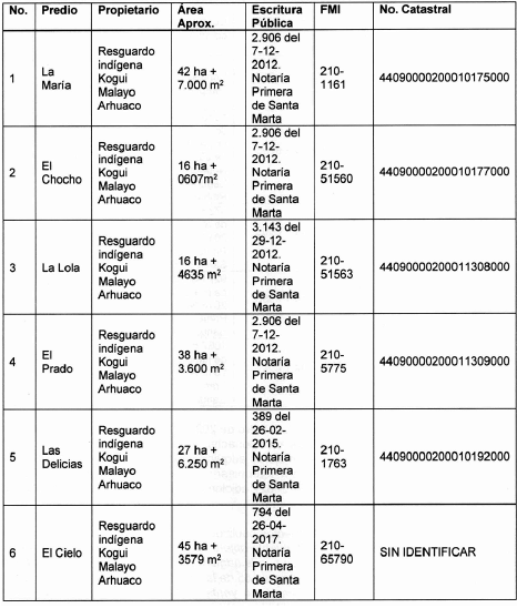 3.1. Inscribir el presente acuerdo en los siguientes Folios de matrícula inmobiliaria: (i) Predio La María identificado con matrícula inmobiliaria número 210- 1161; (ii) Predio El Chocho identificado con matrícula inmobiliaria número 210-51560; (iii) Predio La Lola identificado con matrícula inmobiliaria número 210-51563; (iv) Predio El Prado identificado con matrícula inmobiliaria número 210-5775; (v) Predio Las Delicias identificado con matrícula inmobiliaria número 210-1763; (vii) Predio el Cielo identificado con matrícula inmobiliaria número 210-65790. Los citados Folios deberán contener la inscripción del presente acuerdo, con el código registral 01002 y deberá figurar como propiedad colectiva del resguardo indígena Kogui-Malayo-Arhuaco, el cual se amplía por cuarta vez en virtud del presente acto administrativo.